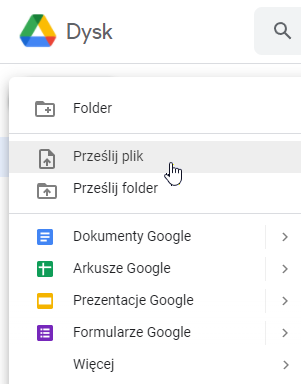 Kolejno, w celu przesłania na Dysk Google pliku – wybierz z listy “prześlij plik”.
