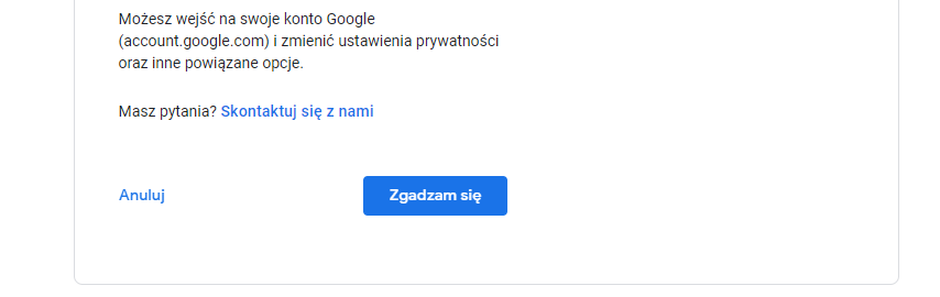 Następnie, aby móc utworzyć konto Google należy przeczytać i potwierdzić prywatność oraz pozostałe warunki korzystania z usług Google. W tym celu należy kliknąć niebieski przycisk “Zgadzam się”